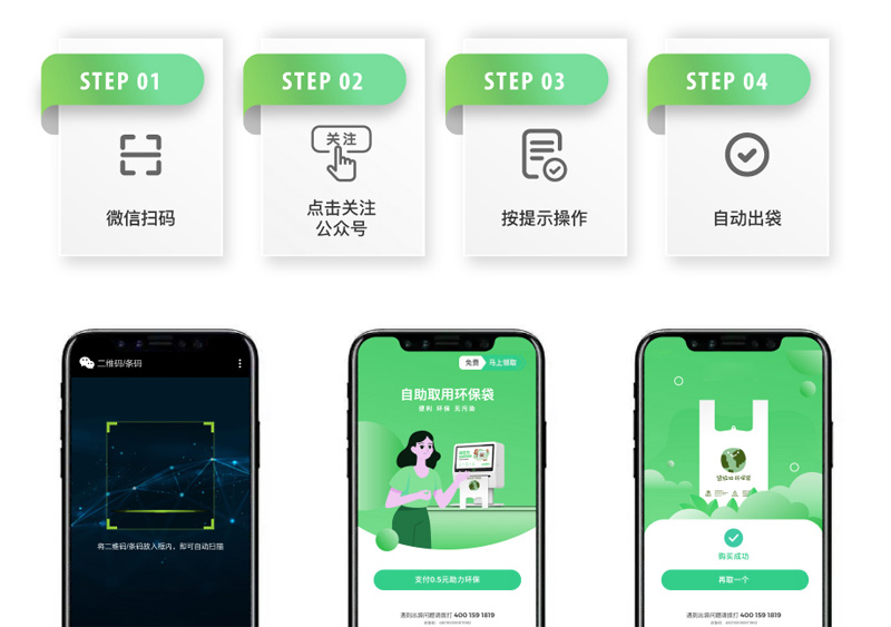 只需簡單四步,便可獲去一個環(huán)保袋。智能監(jiān)控,無人化管理,經(jīng)營管理接近零成本。